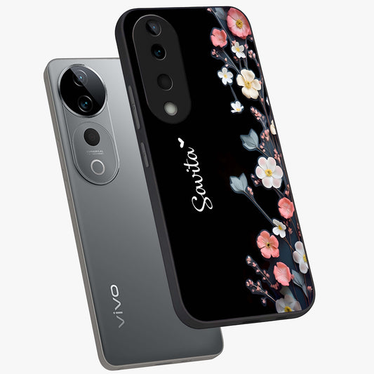 Black Elegance Floral Custom Name Glass Case For Vivo V40